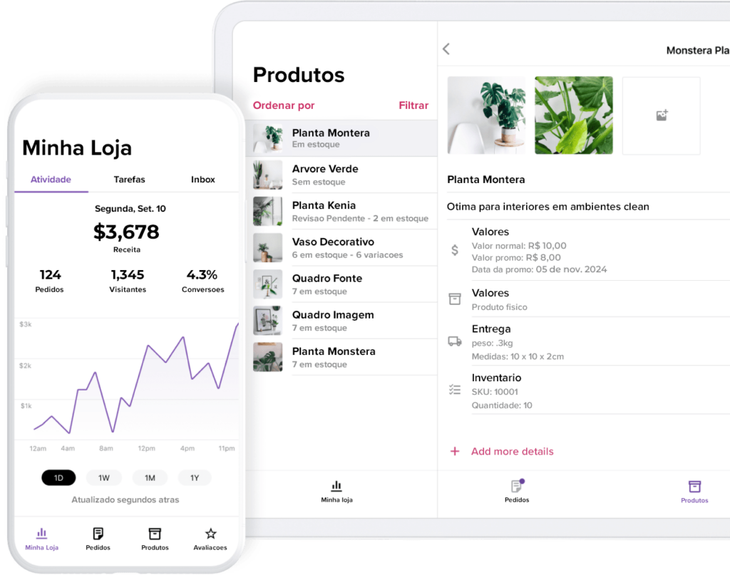 Gerencie sua loja de qualquer lugar. Crie produtos, processe pedidos, acompanhe as principais estatísticas em tempo real e até aceite pagamentos NFC.